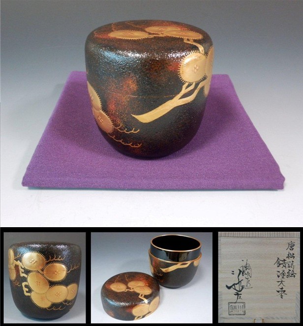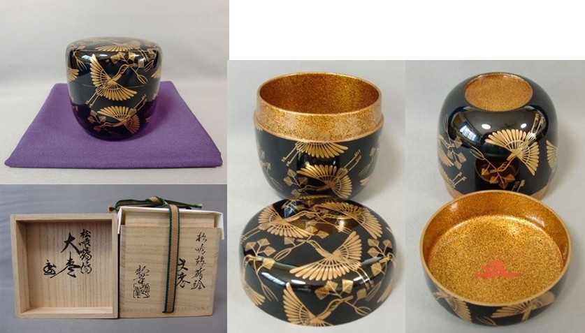 | 岡澤起幸 松喰鶴蒔絵大棗(鵬雲斎宗匠箱書付) 内梨地で立ち上がりにも松の金蒔絵が施された大変に見事なお棗です。 ▽ 詳細は下の画像をクリックしてください ▽